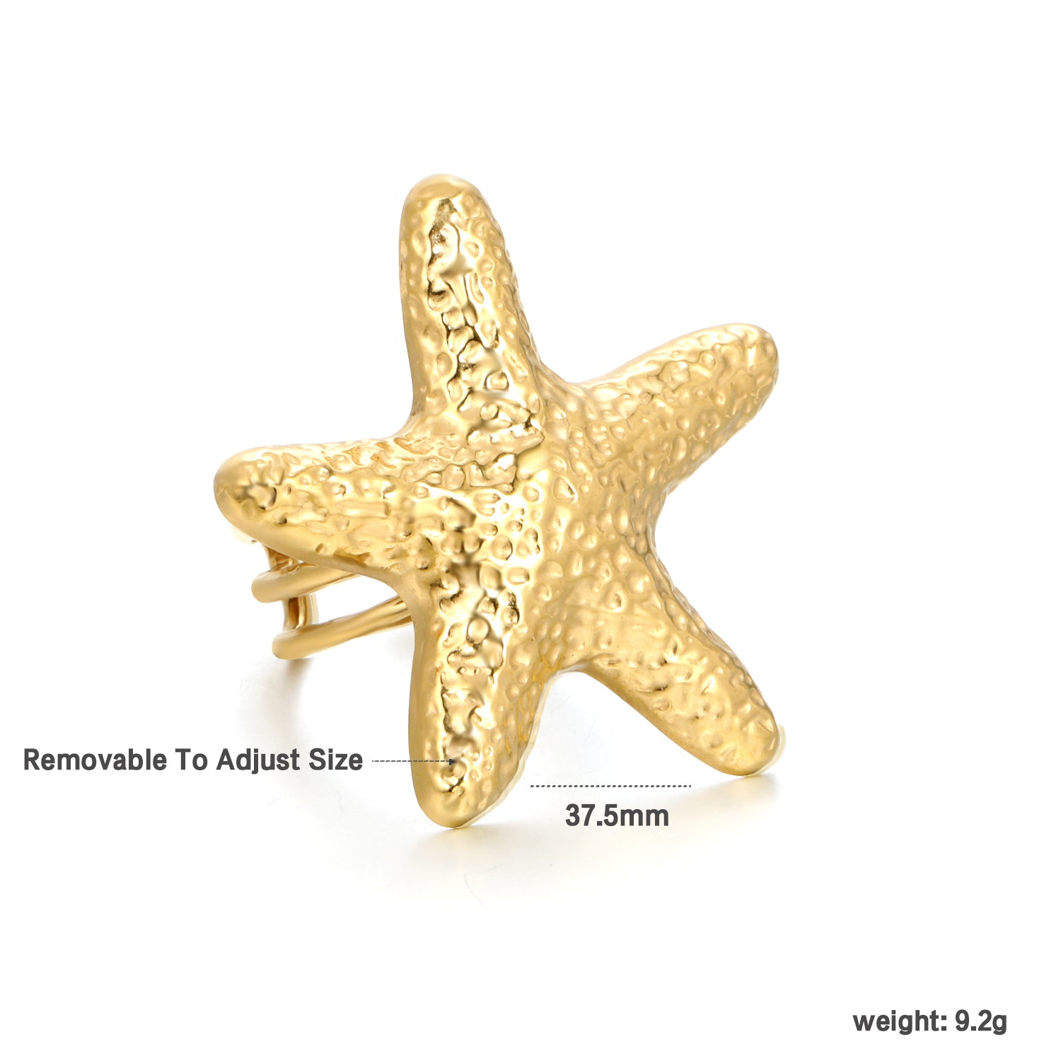 The Gold Atoll Ring showcases a striking large starfish design, beautifully finished with 18K gold PVD for lasting shine. This exquisite piece evokes the spirit of ocean-side vacations, making it an ideal accessory to highlight your elegance and adventurous style wherever you go. Embrace the allure of the sea with this stunning and sophisticated ring.