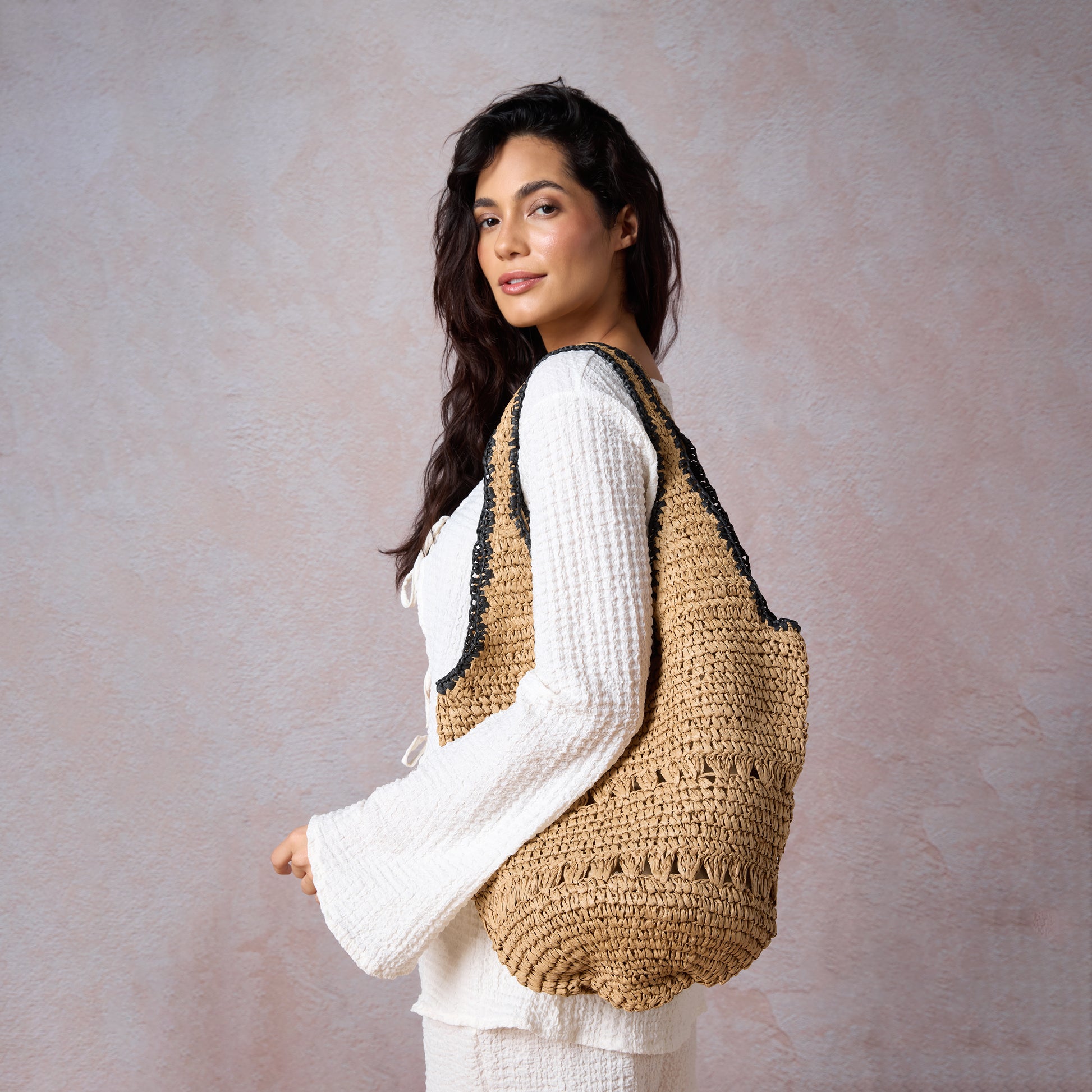 This woven shoulder bag combines natural style with practical design. Measuring 37 cm wide by 40 cm high (excluding the handle), it features a convenient pocket and a secure magnetic closure for easy access and safety. Its spacious interior and lightweight construction make it an ideal companion for daily use or relaxed outings.