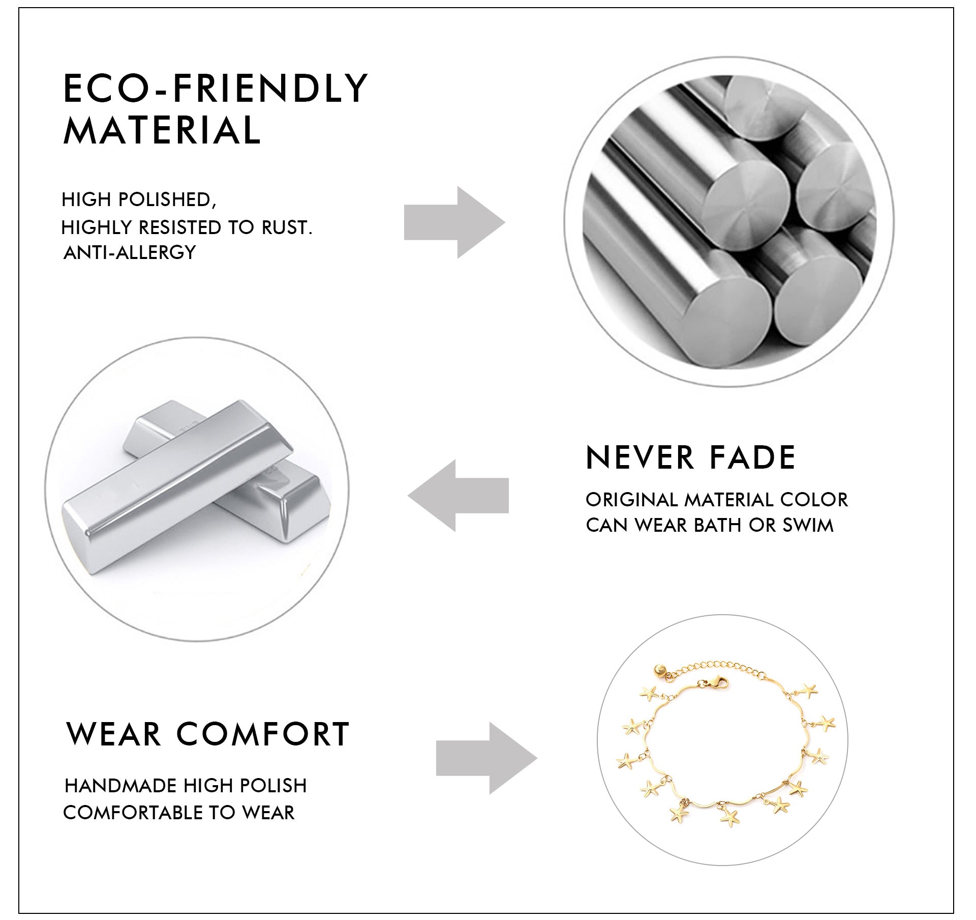 The Starfish Anklet blends elegance with durability, crafted from stainless steel coated with PVD 18k gold for a lasting, tarnish-proof finish. Its waterproof design makes it the perfect accessory for vacations, ensuring style that endures through sun, sand, and sea. This anklet offers both sophistication and resilience, ideal for those seeking a refined yet practical beach accessory.